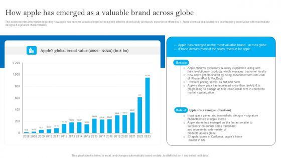 This slide provides information regarding how Apple has become valuable brand across globe in terms of exclusivity and luxury experience offered by it. Apple stores also play vital role in enhancing brand value with minimalistic designs and signature characteristics.Welcome to our selection of the How Apple Has Emerged As A Valuable Brand Apples Brand Promotional Measures Pictures Pdf. These are designed to help you showcase your creativity and bring your sphere to life. Planning and Innovation are essential for any business that is just starting out. This collection contains the designs that you need for your everyday presentations. All of our PowerPoints are 100Precent editable, so you can customize them to suit your needs. This multi-purpose template can be used in various situations. Grab these presentation templates today. This slide provides information regarding how Apple has become valuable brand across globe in terms of exclusivity and luxury experience offered by it. Apple stores also play vital role in enhancing brand value with minimalistic designs And signature characteristics.