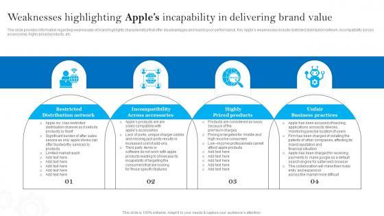 This slide provides information regarding weaknesses of brand highlights characteristics that offer disadvantages and lead to poor performance. Key Apple weaknesses include restricted distribution network, incompatibility across accessories, highly priced products, etc. The best PPT templates are a great way to save time, energy, and resources. Slidegeeks have 100Precent editable powerpoint slides making them incredibly versatile. With these quality presentation templates, you can create a captivating and memorable presentation by combining visually appealing slides and effectively communicating your message. Download Weaknesses Highlighting Apples Incapability Apples Brand Promotional Measures Download Pdf from Slidegeeks and deliver a wonderful presentation. This slide provides information regarding weaknesses of brand highlights characteristics that offer disadvantages and lead to poor performance. Key Apple weaknesses include restricted distribution network, incompatibility across accessories, highly priced products, etc.