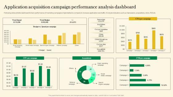 Following slide exhibits dashboard to track performance of marketing campaigns implemented by company to increase application web traffic. It include indicators such as impressions, acquisitions, clicks, ROI etc. Explore a selection of the finest Application Acquisition Campaign Performance Analysis Online Customer Acquisition Microsoft Pdf here. With a plethora of professionally designed and pre-made slide templates, you can quickly and easily find the right one for your upcoming presentation. You can use our Application Acquisition Campaign Performance Analysis Online Customer Acquisition Microsoft Pdf to effectively convey your message to a wider audience. Slidegeeks has done a lot of research before preparing these presentation templates. The content can be personalized and the slides are highly editable. Grab templates today from Slidegeeks. Following slide exhibits dashboard to track performance of marketing campaigns implemented by company to increase application web traffic. It include indicators such as impressions, acquisitions, clicks, ROI etc.