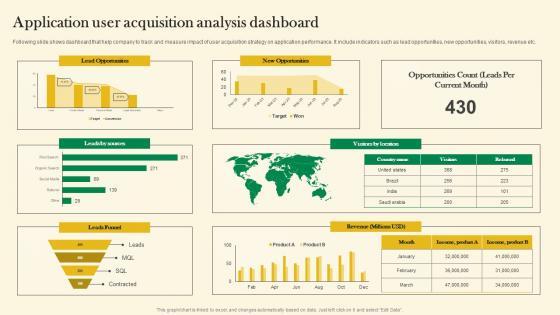 Following slide shows dashboard that help company to track and measure impact of user acquisition strategy on application performance. It include indicators such as lead opportunities, new opportunities, visitors, revenue etc. The best PPT templates are a great way to save time, energy, and resources. Slidegeeks have 100 percent editable powerpoint slides making them incredibly versatile. With these quality presentation templates, you can create a captivating and memorable presentation by combining visually appealing slides and effectively communicating your message. Download Application User Acquisition Analysis Dashboard Online Customer Acquisition Microsoft Pdf from Slidegeeks and deliver a wonderful presentation. Following slide shows dashboard that help company to track and measure impact of user acquisition strategy on application performance. It include indicators such as lead opportunities, new opportunities, visitors, revenue etc.