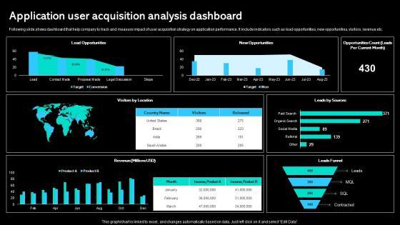 Following slide shows dashboard that help company to track and measure impact of user acquisition strategy on application performance. It include indicators such as lead opportunities, new opportunities, visitors, revenue etc. Do you have to make sure that everyone on your team knows about any specific topic I yes, then you should give Application User Acquisition Analysis Dashboard Paid Marketing Approach Rules Pdf a try. Our experts have put a lot of knowledge and effort into creating this impeccable Application User Acquisition Analysis Dashboard Paid Marketing Approach Rules Pdf You can use this template for your upcoming presentations, as the slides are perfect to represent even the tiniest detail. You can download these templates from the Slidegeeks website and these are easy to edit. So grab these today. Following slide shows dashboard that help company to track and measure impact of user acquisition strategy on application performance. It include indicators such as lead opportunities, new opportunities, visitors, revenue etc.