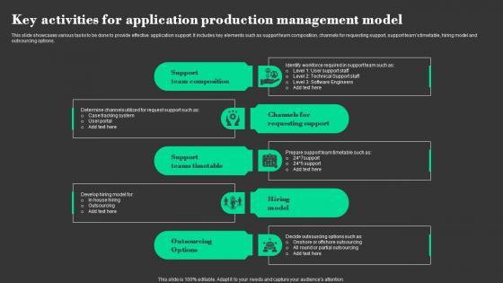 This slide showcases various tasks to be done to provide effective application support. It includes key elements such as support team composition, channels for requesting support, support teams timetable, hiring model and outsourcing options. Showcasing this set of slides titled Key Activities For Application Production Management Model Demonstration Pdf The topics addressed in these templates are Support Team Composition, Support Teams Timetable, Hiring Model All the content presented in this PPT design is completely editable. Download it and make adjustments in color, background, font etc. as per your unique business setting. This slide showcases various tasks to be done to provide effective application support. It includes key elements such as support team composition, channels for requesting support, support teams timetable, hiring model and outsourcing options.