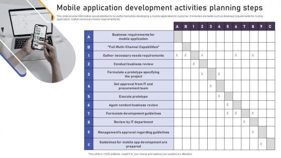 This slide provide information about activities to be performed while developing a mobile application for customer. It includes elements such as Business requirements for mobile application, Gather necessary needs requirements etc. Showcasing this set of slides titled Mobile Application Development Activities Planning Steps Pictures Pdf. The topics addressed in these templates are Conduct Business Review, Formulate Development Guidelines. All the content presented in this PPT design is completely editable. Download it and make adjustments in color, background, font etc. as per your unique business setting. This slide provide information about activities to be performed while developing a mobile application for customer. It includes elements such as Business requirements for mobile application, Gather necessary needs requirements etc.