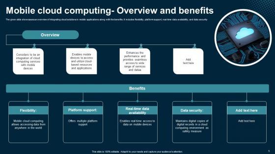 The given slide showcases an overview of integrating cloud solutions in mobile applications along with the benefits. It includes flexibility, platform support, real-time data availability, and data security. Presenting this PowerPoint presentation, titled Mobile Cloud Computing Overview And Benefits Application Areas Of Mobile Cloud Computing, with topics curated by our researchers after extensive research. This editable presentation is available for immediate download and provides attractive features when used. Download now and captivate your audience. Presenting this Mobile Cloud Computing Overview And Benefits Application Areas Of Mobile Cloud Computing. Our researchers have carefully researched and created these slides with all aspects taken into consideration. This is a completely customizable Mobile Cloud Computing Overview And Benefits Application Areas Of Mobile Cloud Computing that is available for immediate downloading. Download now and make an impact on your audience. Highlight the attractive features available with our PPTs. The given slide showcases an overview of integrating cloud solutions in mobile applications along with the benefits. It includes flexibility, platform support, real-time data availability, and data security