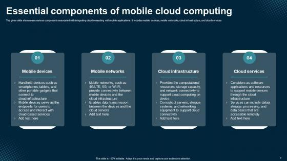 The given slide showcases various components associated with integrating cloud computing with mobile applications. It includes mobile devices, mobile networks, cloud infrastructure, and cloud services. Do you have an important presentation coming up Are you looking for something that will make your presentation stand out from the rest Look no further than Essential Components Of Mobile Cloud Computing Application Areas Of Mobile Cloud Computing. With our professional designs, you can trust that your presentation will pop and make delivering it a smooth process. And with Slidegeeks, you can trust that your presentation will be unique and memorable. So why wait Grab Essential Components Of Mobile Cloud Computing Application Areas Of Mobile Cloud Computing today and make your presentation stand out from the rest The given slide showcases various components associated with integrating cloud computing with mobile applications. It includes mobile devices, mobile networks, cloud infrastructure, and cloud services