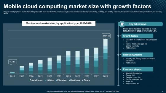 The given slide highlights the market share of the global mobile cloud market which is primarily used by business users because they improve scalability, availability, and reliability. It also includes key takeaways which consist of growth factors, and restraining factors. Slidegeeks has constructed Mobile Cloud Computing Market Size With Growth Application Areas Of Mobile Cloud Computing after conducting extensive research and examination. These presentation templates are constantly being generated and modified based on user preferences and critiques from editors. Here, you will find the most attractive templates for a range of purposes while taking into account ratings and remarks from users regarding the content. This is an excellent jumping-off point to explore our content and will give new users an insight into our top-notch PowerPoint Templates. The given slide highlights the market share of the global mobile cloud market which is primarily used by business users because they improve scalability, availability, and reliability. It also includes key takeaways which consist of growth factors, and restraining factors