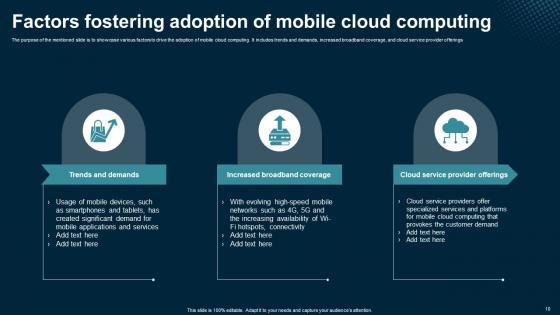 The purpose of the mentioned slide is to showcase various factors to drive the adoption of mobile cloud computing. It includes trends and demands, increased broadband coverage, and cloud service provider offerings. Whether you have daily or monthly meetings, a brilliant presentation is necessary. Factors Fostering Adoption Of Mobile Cloud Application Areas Of Mobile Cloud Computing can be your best option for delivering a presentation. Represent everything in detail using Factors Fostering Adoption Of Mobile Cloud Application Areas Of Mobile Cloud Computing and make yourself stand out in meetings. The template is versatile and follows a structure that will cater to your requirements. All the templates prepared by Slidegeeks are easy to download and edit. Our research experts have taken care of the corporate themes as well. So, give it a try and see the results. The purpose of the mentioned slide is to showcase various factors to drive the adoption of mobile cloud computing. It includes trends and demands, increased broadband coverage, and cloud service provider offerings