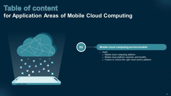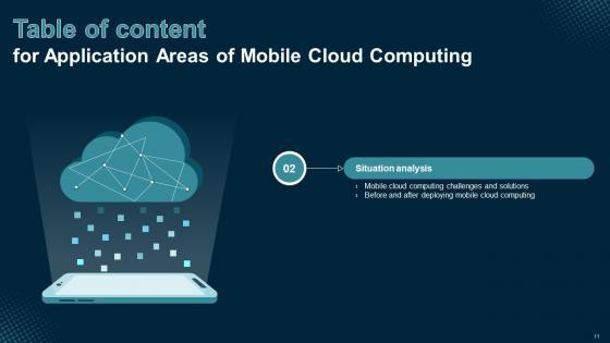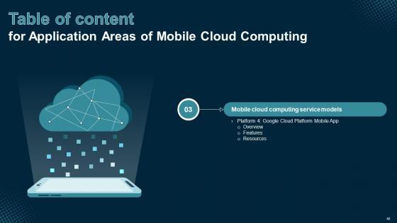 This Table Of Contents For Application Areas Of Mobile Cloud Computing Ppt Information is perfect for any presentation, be it in front of clients or colleagues. It is a versatile and stylish solution for organizing your meetings. The Table Of Contents For Application Areas Of Mobile Cloud Computing Ppt Information features a modern design for your presentation meetings. The adjustable and customizable slides provide unlimited possibilities for acing up your presentation. Slidegeeks has done all the homework before launching the product for you. So, do not wait, grab the presentation templates today Our Table Of Contents For Application Areas Of Mobile Cloud Computing Ppt Information are topically designed to provide an attractive backdrop to any subject. Use them to look like a presentation pro.