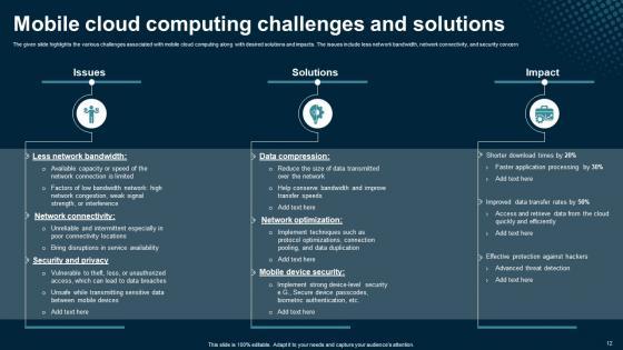 The given slide highlights the various challenges associated with mobile cloud computing along with desired solutions and impacts. The issues include less network bandwidth, network connectivity, and security concern. Retrieve professionally designed Mobile Cloud Computing Challenges And Solutions Application Areas Of Mobile Cloud Computing to effectively convey your message and captivate your listeners. Save time by selecting pre-made slideshows that are appropriate for various topics, from business to educational purposes. These themes come in many different styles, from creative to corporate, and all of them are easily adjustable and can be edited quickly. Access them as PowerPoint templates or as Google Slides themes. You do not have to go on a hunt for the perfect presentation because Slidegeeks got you covered from everywhere. The given slide highlights the various challenges associated with mobile cloud computing along with desired solutions and impacts. The issues include less network bandwidth, network connectivity, and security concern