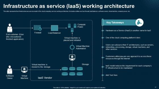 This slide represents the infrastructure as a service model of the cloud computing service working architecture. It includes entities such as firewall, load balancer, software owner, virtual machine, compute power, etc. Coming up with a presentation necessitates that the majority of the effort goes into the content and the message you intend to convey. The visuals of a PowerPoint presentation can only be effective if it supplements and supports the story that is being told. Keeping this in mind our experts created Infrastructure As Service IaaS Working Architecture Application Areas Of Mobile Cloud Computing to reduce the time that goes into designing the presentation. This way, you can concentrate on the message while our designers take care of providing you with the right template for the situation. This slide represents the infrastructure as a service model of the cloud computing service working architecture. It includes entities such as firewall, load balancer, software owner, virtual machine, compute power, etc.