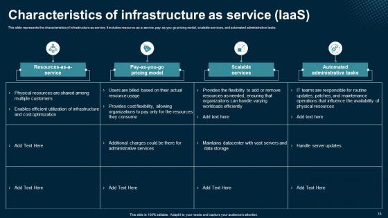 This slide represents the characteristics of infrastructure as service. It includes resource-as-a-service, pay-as-you-go pricing model, scalable services, and automated administrative tasks. Get a simple yet stunning designed Characteristics Of Infrastructure As Service Application Areas Of Mobile Cloud Computing. It is the best one to establish the tone in your meetings. It is an excellent way to make your presentations highly effective. So, download this PPT today from Slidegeeks and see the positive impacts. Our easy-to-edit Characteristics Of Infrastructure As Service Application Areas Of Mobile Cloud Computing can be your go-to option for all upcoming conferences and meetings. So, what are you waiting for Grab this template today. This slide represents the characteristics of infrastructure as service. It includes resource-as-a-service, pay-as-you-go pricing model, scalable services, and automated administrative tasks