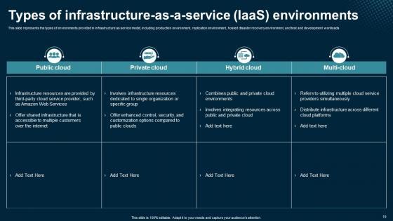 This slide represents the types of environments provided in infrastructure as service model, including production environment, replication environment, hosted disaster recovery environment, and test and development workloads. Welcome to our selection of the Types Of Infrastructure As A Service IaaS Environments Application Areas Of Mobile Cloud Computing. These are designed to help you showcase your creativity and bring your sphere to life. Planning and Innovation are essential for any business that is just starting out. This collection contains the designs that you need for your everyday presentations. All of our PowerPoints are 100Percent editable, so you can customize them to suit your needs. This multi-purpose template can be used in various situations. Grab these presentation templates today. This slide represents the types of environments provided in infrastructure as service model, including production environment, replication environment, hosted disaster recovery environment, and test and development workloads