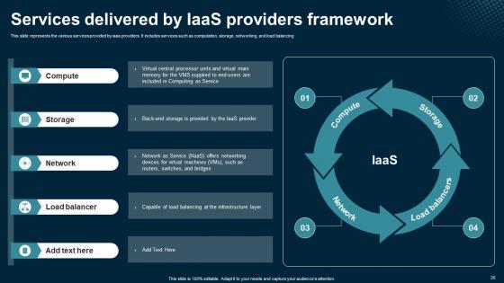 This slide represents the various services provided by iaas providers. It includes services such as computation, storage, networking, and load balancing. Take your projects to the next level with our ultimate collection of Services Delivered By IaaS Providers Framework Application Areas Of Mobile Cloud Computing. Slidegeeks has designed a range of layouts that are perfect for representing task or activity duration, keeping track of all your deadlines at a glance. Tailor these designs to your exact needs and give them a truly corporate look with your own brand colors they will make your projects stand out from the rest This slide represents the various services provided by iaas providers. It includes services such as computation, storage, networking, and load balancing