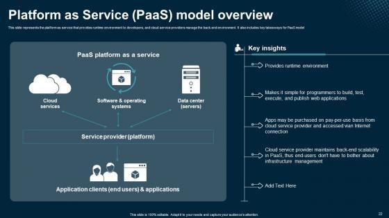 This slide represents the platform as service that provides runtime environment to developers, and cloud service providers manage the back-end environment. It also includes key takeaways for PaaS model. Slidegeeks has constructed Platform As Service PaaS Model Overview Application Areas Of Mobile Cloud Computing after conducting extensive research and examination. These presentation templates are constantly being generated and modified based on user preferences and critiques from editors. Here, you will find the most attractive templates for a range of purposes while taking into account ratings and remarks from users regarding the content. This is an excellent jumping-off point to explore our content and will give new users an insight into our top-notch PowerPoint Templates. This slide represents the platform as service that provides runtime environment to developers, and cloud service providers manage the back-end environment. It also includes key takeaways for PaaS model