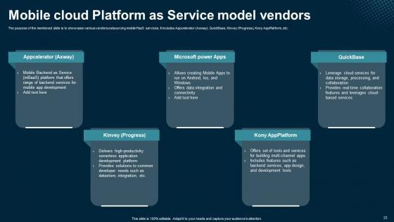 The purpose of the mentioned slide is to showcase various vendors outsourcing mobile PaaS services. It includes Appcelerator Axway , QuickBase, Kinvey Progress , Kony AppPlatform, etc. This Mobile Cloud Platform As Service Model Vendors Application Areas Of Mobile Cloud Computing is perfect for any presentation, be it in front of clients or colleagues. It is a versatile and stylish solution for organizing your meetings. The Mobile Cloud Platform As Service Model Vendors Application Areas Of Mobile Cloud Computing features a modern design for your presentation meetings. The adjustable and customizable slides provide unlimited possibilities for acing up your presentation. Slidegeeks has done all the homework before launching the product for you. So, do not wait, grab the presentation templates today The purpose of the mentioned slide is to showcase various vendors outsourcing mobile PaaS services. It includes Appcelerator Axway , QuickBase, Kinvey Progress , Kony AppPlatform, etc.