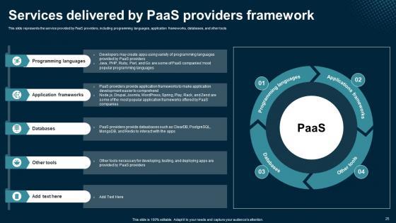 This slide represents the service provided by PaaS providers, including programming languages, application frameworks, databases, and other tools. Do you know about Slidesgeeks Services Delivered By PaaS Providers Framework Application Areas Of Mobile Cloud Computing These are perfect for delivering any kind od presentation. Using it, create PowerPoint presentations that communicate your ideas and engage audiences. Save time and effort by using our pre-designed presentation templates that are perfect for a wide range of topic. Our vast selection of designs covers a range of styles, from creative to business, and are all highly customizable and easy to edit. Download as a PowerPoint template or use them as Google Slides themes. This slide represents the service provided by PaaS providers, including programming languages, application frameworks, databases, and other tools