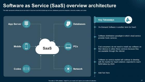 Coming up with a presentation necessitates that the majority of the effort goes into the content and the message you intend to convey. The visuals of a PowerPoint presentation can only be effective if it supplements and supports the story that is being told. Keeping this in mind our experts created Software As Service SaaS Overview Architecture Application Areas Of Mobile Cloud Computing to reduce the time that goes into designing the presentation. This way, you can concentrate on the message while our designers take care of providing you with the right template for the situation. This slide represents software as service model of cloud services that includes app servers, databases, personal computers, networks, mobiles, and codes
