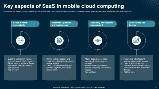 The mentioned slide highlights the various key aspects of SaaS model in mobile cloud computing. It includes cross-platform compatibility, automatic updates and maintenance, scalability and resource management, etc. This modern and well-arranged Key Aspects Of SaaS In Mobile Cloud Computing Application Areas Of Mobile Cloud Computing provides lots of creative possibilities. It is very simple to customize and edit with the Powerpoint Software. Just drag and drop your pictures into the shapes. All facets of this template can be edited with Powerpoint, no extra software is necessary. Add your own material, put your images in the places assigned for them, adjust the colors, and then you can show your slides to the world, with an animated slide included. The mentioned slide highlights the various key aspects of SaaS model in mobile cloud computing. It includes cross-platform compatibility, automatic updates and maintenance, scalability and resource management, etc.