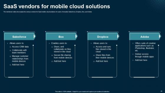 The mentioned slide showcases the various vendors for SaaS mobile cloud solutions for users. It includes Salesforce, Dropbox, Box, and Adobe. This SaaS Vendors For Mobile Cloud Solutions Application Areas Of Mobile Cloud Computing from Slidegeeks makes it easy to present information on your topic with precision. It provides customization options, so you can make changes to the colors, design, graphics, or any other component to create a unique layout. It is also available for immediate download, so you can begin using it right away. Slidegeeks has done good research to ensure that you have everything you need to make your presentation stand out. Make a name out there for a brilliant performance. The mentioned slide showcases the various vendors for SaaS mobile cloud solutions for users. It includes Salesforce, Dropbox, Box, and Adobe