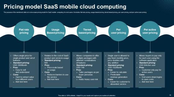 The purpose of the mentioned slide is to showcase pricing model for SaaS mobile computing for end-users. It includes flat rate pricing, usage-based pricing, tiered-based pricing, per-user pricing, and per active user pricing. Presenting this PowerPoint presentation, titled Pricing Model SaaS Mobile Cloud Computing Application Areas Of Mobile Cloud Computing, with topics curated by our researchers after extensive research. This editable presentation is available for immediate download and provides attractive features when used. Download now and captivate your audience. Presenting this Pricing Model SaaS Mobile Cloud Computing Application Areas Of Mobile Cloud Computing. Our researchers have carefully researched and created these slides with all aspects taken into consideration. This is a completely customizable Pricing Model SaaS Mobile Cloud Computing Application Areas Of Mobile Cloud Computing that is available for immediate downloading. Download now and make an impact on your audience. Highlight the attractive features available with our PPTs. The purpose of the mentioned slide is to showcase pricing model for SaaS mobile computing for end-users. It includes flat rate pricing, usage-based pricing, tiered-based pricing, per-user pricing, and per active user pricing