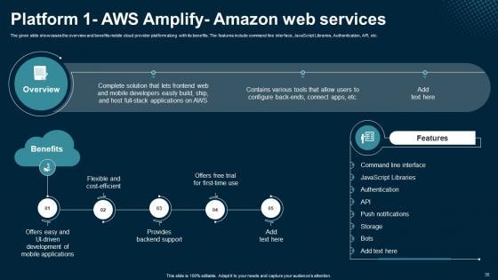 The given slide showcases the overview and benefits mobile cloud provider platform along with its benefits. The features include command line interface, JavaScript Libraries, Authentication, API, etc. The Platform 1 AWS Amplify Amazon Web Services Application Areas Of Mobile Cloud Computing is a compilation of the most recent design trends as a series of slides. It is suitable for any subject or industry presentation, containing attractive visuals and photo spots for businesses to clearly express their messages. This template contains a variety of slides for the user to input data, such as structures to contrast two elements, bullet points, and slides for written information. Slidegeeks is prepared to create an impression. The given slide showcases the overview and benefits mobile cloud provider platform along with its benefits. The features include command line interface, JavaScript Libraries, Authentication, API, etc.