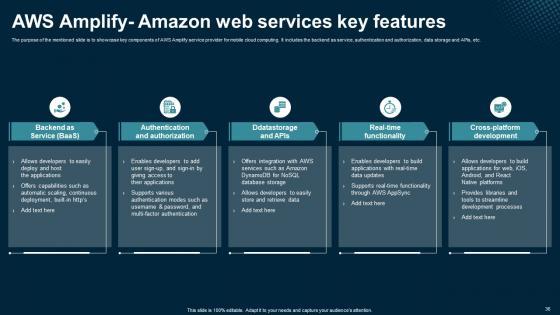 The purpose of the mentioned slide is to showcase key components of AWS Amplify service provider for mobile cloud computing. It includes the backend as service, authentication and authorization, data storage and APIs, etc. Want to ace your presentation in front of a live audience Our AWS Amplify Amazon Web Services Key Features Application Areas Of Mobile Cloud Computing can help you do that by engaging all the users towards you. Slidegeeks experts have put their efforts and expertise into creating these impeccable powerpoint presentations so that you can communicate your ideas clearly. Moreover, all the templates are customizable, and easy-to-edit and downloadable. Use these for both personal and commercial use. The purpose of the mentioned slide is to showcase key components of AWS Amplify service provider for mobile cloud computing. It includes the backend as service, authentication and authorization, data storage and APIs, etc.