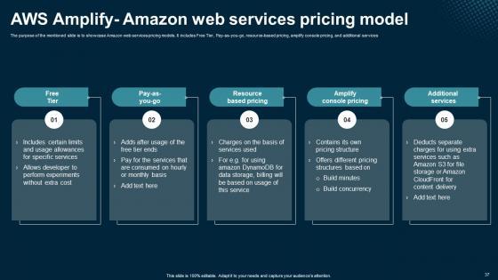 The purpose of the mentioned slide is to showcase Amazon web services pricing models. It includes Free Tier, Pay-as-you-go, resource-based pricing, amplify console pricing, and additional services. There are so many reasons you need a AWS Amplify Amazon Web Services Pricing Model Application Areas Of Mobile Cloud Computing. The first reason is you can not spend time making everything from scratch, Thus, Slidegeeks has made presentation templates for you too. You can easily download these templates from our website easily. The purpose of the mentioned slide is to showcase Amazon web services pricing models. It includes Free Tier, Pay-as-you-go, resource-based pricing, amplify console pricing, and additional services