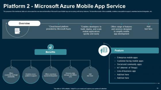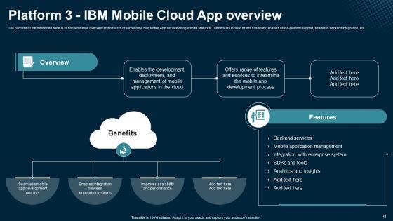 Retrieve professionally designed Platform 3 IBM Mobile Cloud App Overview Application Areas Of Mobile Cloud Computing to effectively convey your message and captivate your listeners. Save time by selecting pre-made slideshows that are appropriate for various topics, from business to educational purposes. These themes come in many different styles, from creative to corporate, and all of them are easily adjustable and can be edited quickly. Access them as PowerPoint templates or as Google Slides themes. You do not have to go on a hunt for the perfect presentation because Slidegeeks got you covered from everywhere. The purpose of the mentioned slide is to showcase the overview and benefits of Microsoft Azure Mobile App service along with its features. The benefits include offers scalability, enables cross-platform support, seamless backend integration, etc.