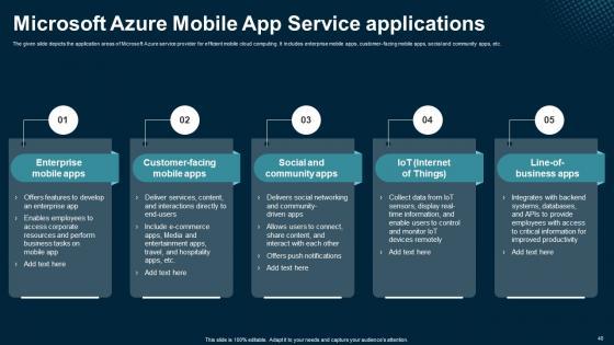 The given slide depicts the application areas of Microsoft Azure service provider for efficient mobile cloud computing. It includes enterprise mobile apps, customer-facing mobile apps, social and community apps, etc. The Microsoft Azure Mobile App Service Applications Application Areas Of Mobile Cloud Computing is a compilation of the most recent design trends as a series of slides. It is suitable for any subject or industry presentation, containing attractive visuals and photo spots for businesses to clearly express their messages. This template contains a variety of slides for the user to input data, such as structures to contrast two elements, bullet points, and slides for written information. Slidegeeks is prepared to create an impression. The given slide depicts the application areas of Microsoft Azure service provider for efficient mobile cloud computing. It includes enterprise mobile apps, customer-facing mobile apps, social and community apps, etc.