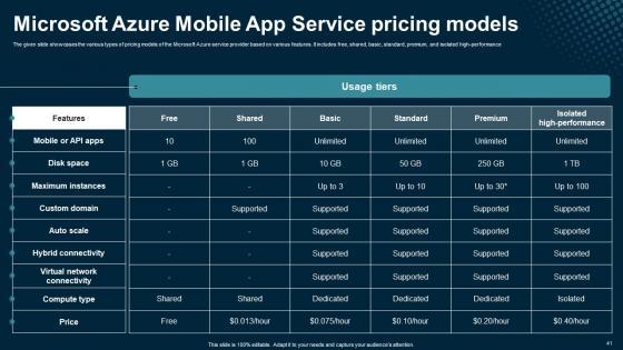 The given slide showcases the various types of pricing models of the Microsoft Azure service provider based on various features. It includes free, shared, basic, standard, premium, and isolated high-performance. Are you searching for a Microsoft Azure Mobile App Service Pricing Models Application Areas Of Mobile Cloud Computing that is uncluttered, straightforward, and original Its easy to edit, and you can change the colors to suit your personal or business branding. For a presentation that expresses how much effort you have put in, this template is ideal With all of its features, including tables, diagrams, statistics, and lists, its perfect for a business plan presentation. Make your ideas more appealing with these professional slides. Download Microsoft Azure Mobile App Service Pricing Models Application Areas Of Mobile Cloud Computing from Slidegeeks today. The given slide showcases the various types of pricing models of the Microsoft Azure service provider based on various features. It includes free, shared, basic, standard, premium, and isolated high-performance