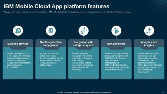 The purpose of the mentioned slide is to showcase the various features of IBM mobile cloud application. It includes bankend services, mobile application management, integration with enterprise system, etc. Crafting an eye-catching presentation has never been more straightforward. Let your presentation shine with this tasteful yet straightforward IBM Mobile Cloud App Platform Features Application Areas Of Mobile Cloud Computing template. It offers a minimalistic and classy look that is great for making a statement. The colors have been employed intelligently to add a bit of playfulness while still remaining professional. Construct the ideal IBM Mobile Cloud App Platform Features Application Areas Of Mobile Cloud Computing that effortlessly grabs the attention of your audience Begin now and be certain to wow your customers The purpose of the mentioned slide is to showcase the various features of IBM mobile cloud application. It includes bankend services, mobile application management, integration with enterprise system, etc.