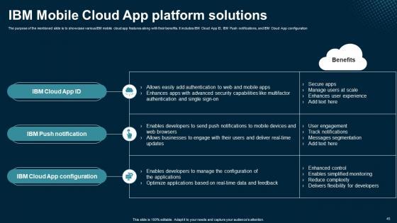 The purpose of the mentioned slide is to showcase various IBM mobile cloud app features along with their benefits. It includes IBM Cloud App ID, IBM Push notifications, and IBM Cloud App configuration. Make sure to capture your audiences attention in your business displays with our gratis customizable IBM Mobile Cloud App Platform Solutions Application Areas Of Mobile Cloud Computing. These are great for business strategies, office conferences, capital raising or task suggestions. If you desire to acquire more customers for your tech business and ensure they stay satisfied, create your own sales presentation with these plain slides. The purpose of the mentioned slide is to showcase various IBM mobile cloud app features along with their benefits. It includes IBM Cloud App ID, IBM Push notifications, and IBM Cloud App configuration.