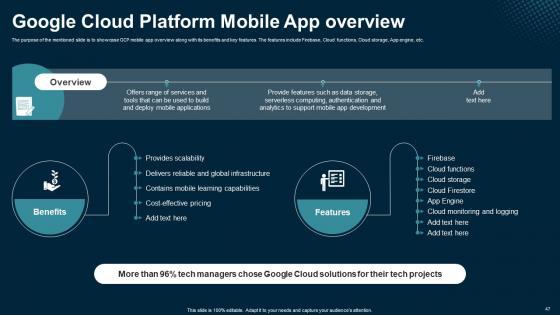 The purpose of the mentioned slide is to showcase GCP mobile app overview along with its benefits and key features. The features include Firebase, Cloud functions, Cloud storage, App engine, etc. If you are looking for a format to display your unique thoughts, then the professionally designed Google Cloud Platform Mobile App Overview Application Areas Of Mobile Cloud Computing is the one for you. You can use it as a Google Slides template or a PowerPoint template. Incorporate impressive visuals, symbols, images, and other charts. Modify or reorganize the text boxes as you desire. Experiment with shade schemes and font pairings. Alter, share or cooperate with other people on your work. Download Google Cloud Platform Mobile App Overview Application Areas Of Mobile Cloud Computing and find out how to give a successful presentation. Present a perfect display to your team and make your presentation unforgettable. The purpose of the mentioned slide is to showcase GCP mobile app overview along with its benefits and key features. The features include Firebase, Cloud functions, Cloud storage, App engine, etc.
