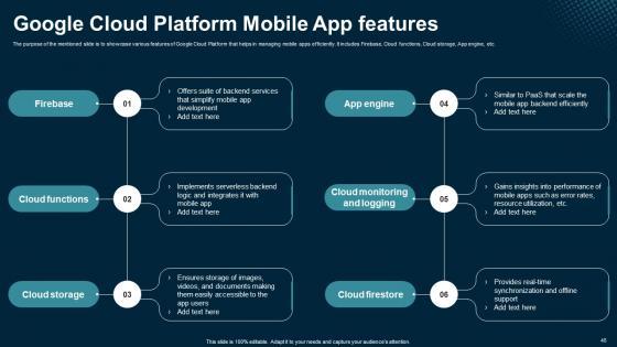 The purpose of the mentioned slide is to showcase various features of Google Cloud Platform that helps in managing mobile apps efficiently. It includes Firebase, Cloud functions, Cloud storage, App engine, etc. If your project calls for a presentation, then Slidegeeks is your go-to partner because we have professionally designed, easy-to-edit templates that are perfect for any presentation. After downloading, you can easily edit Google Cloud Platform Mobile App Features Application Areas Of Mobile Cloud Computing and make the changes accordingly. You can rearrange slides or fill them with different images. Check out all the handy templates The purpose of the mentioned slide is to showcase various features of Google Cloud Platform that helps in managing mobile apps efficiently. It includes Firebase, Cloud functions, Cloud storage, App engine, etc.