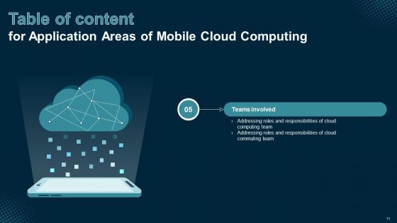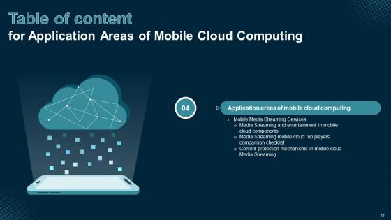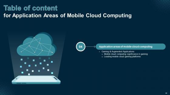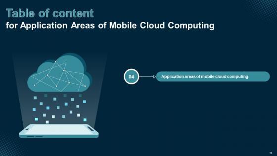 This modern and well-arranged Table Of Content Application Areas Of Mobile Cloud Computing Ppt Formates provides lots of creative possibilities. It is very simple to customize and edit with the Powerpoint Software. Just drag and drop your pictures into the shapes. All facets of this template can be edited with Powerpoint, no extra software is necessary. Add your own material, put your images in the places assigned for them, adjust the colors, and then you can show your slides to the world, with an animated slide included. Our Table Of Content Application Areas Of Mobile Cloud Computing Ppt Formates are topically designed to provide an attractive backdrop to any subject. Use them to look like a presentation pro.