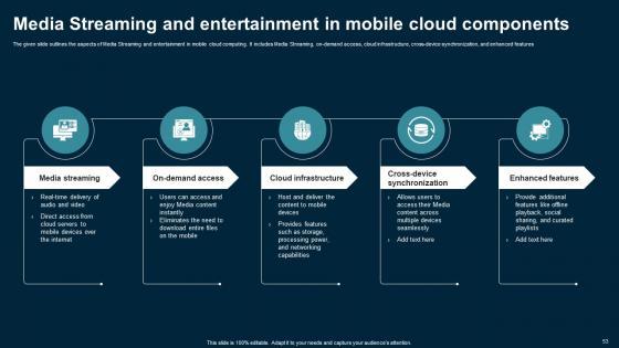 The given slide outlines the aspects of Media Streaming and entertainment in mobile cloud computing. It includes Media Streaming, on-demand access, cloud infrastructure, cross-device synchronization, and enhanced features. Explore a selection of the finest Media Streaming And Entertainment In Mobile Application Areas Of Mobile Cloud Computing here. With a plethora of professionally designed and pre-made slide templates, you can quickly and easily find the right one for your upcoming presentation. You can use our Media Streaming And Entertainment In Mobile Application Areas Of Mobile Cloud Computing to effectively convey your message to a wider audience. Slidegeeks has done a lot of research before preparing these presentation templates. The content can be personalized and the slides are highly editable. Grab templates today from Slidegeeks. The given slide outlines the aspects of Media Streaming and entertainment in mobile cloud computing. It includes Media Streaming, on-demand access, cloud infrastructure, cross-device synchronization, and enhanced features