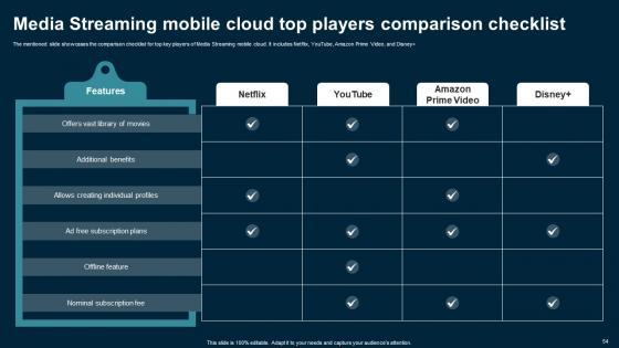 The mentioned slide showcases the comparison checklist for top key players of Media Streaming mobile cloud. It includes Netflix, YouTube, Amazon Prime Video, and Disney plus. The best PPT templates are a great way to save time, energy, and resources. Slidegeeks have 100 percent editable powerpoint slides making them incredibly versatile. With these quality presentation templates, you can create a captivating and memorable presentation by combining visually appealing slides and effectively communicating your message. Download Media Streaming Mobile Cloud Top Players Application Areas Of Mobile Cloud Computing from Slidegeeks and deliver a wonderful presentation. The mentioned slide showcases the comparison checklist for top key players of Media Streaming mobile cloud. It includes Netflix, YouTube, Amazon Prime Video, and Disney plus.