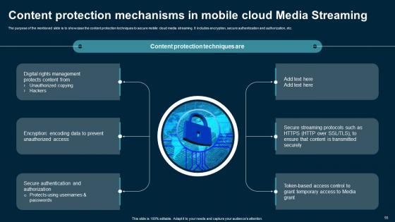 The purpose of the mentioned slide is to showcase the content protection techniques to secure mobile cloud media streaming. It includes encryption, secure authentication and authorization, etc. From laying roadmaps to briefing everything in detail, our templates are perfect for you. You can set the stage with your presentation slides. All you have to do is download these easy-to-edit and customizable templates. Content Protection Mechanisms In Mobile Application Areas Of Mobile Cloud Computing will help you deliver an outstanding performance that everyone would remember and praise you for. Do download this presentation today. The purpose of the mentioned slide is to showcase the content protection techniques to secure mobile cloud media streaming. It includes encryption, secure authentication and authorization, etc.