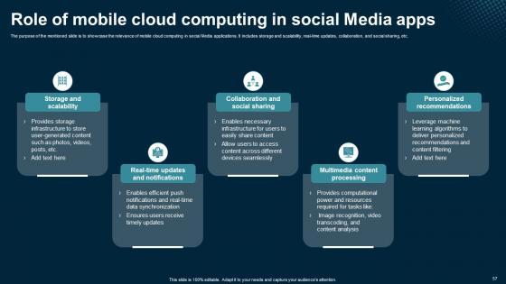 The purpose of the mentioned slide is to showcase the relevance of mobile cloud computing in social Media applications. It includes storage and scalability, real-time updates, collaboration, and social sharing, etc. Here you can discover an assortment of the finest PowerPoint and Google Slides templates. With these templates, you can create presentations for a variety of purposes while simultaneously providing your audience with an eye-catching visual experience. Download Role Of Mobile Cloud Computing In Social Media Apps Application Areas Of Mobile Cloud Computing to deliver an impeccable presentation. These templates will make your job of preparing presentations much quicker, yet still, maintain a high level of quality. Slidegeeks has experienced researchers who prepare these templates and write high-quality content for you. Later on, you can personalize the content by editing the Role Of Mobile Cloud Computing In Social Media Apps Application Areas Of Mobile Cloud Computing. The purpose of the mentioned slide is to showcase the relevance of mobile cloud computing in social Media applications. It includes storage and scalability, real-time updates, collaboration, and social sharing, etc.