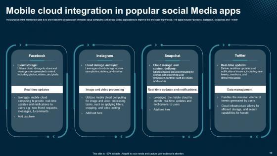 The purpose of the mentioned slide is to showcase the collaboration of mobile cloud computing with social Media applications to improve the end-user experience. The apps include Facebook, Instagram, Snapchat, and Twitter. This modern and well-arranged Mobile Cloud Integration In Popular Social Media Application Areas Of Mobile Cloud Computing provides lots of creative possibilities. It is very simple to customize and edit with the Powerpoint Software. Just drag and drop your pictures into the shapes. All facets of this template can be edited with Powerpoint, no extra software is necessary. Add your own material, put your images in the places assigned for them, adjust the colors, and then you can show your slides to the world, with an animated slide included. The purpose of the mentioned slide is to showcase the collaboration of mobile cloud computing with social Media applications to improve the end-user experience. The apps include Facebook, Instagram, Snapchat, and Twitter
