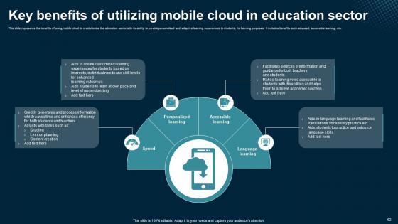 This slide represents the benefits of using mobile cloud to revolutionize the education sector with its ability to provide personalized and adaptive learning experiences to students, for learning purposes. It includes benefits such as speed, accessible learning, etc. This Key Benefits Of Utilizing Mobile Cloud In Application Areas Of Mobile Cloud Computing is perfect for any presentation, be it in front of clients or colleagues. It is a versatile and stylish solution for organizing your meetings. The Key Benefits Of Utilizing Mobile Cloud In Application Areas Of Mobile Cloud Computing features a modern design for your presentation meetings. The adjustable and customizable slides provide unlimited possibilities for acing up your presentation. Slidegeeks has done all the homework before launching the product for you. So, do not wait, grab the presentation templates today This slide represents the benefits of using mobile cloud to revolutionize the education sector with its ability to provide personalized and adaptive learning experiences to students, for learning purposes. It includes benefits such as speed, accessible learning, etc.