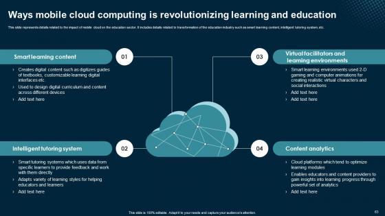 This slide represents details related to the impact of mobile cloud on the education sector. It includes details related to transformation of the education industry such as smart learning content, intelligent tutoring system, etc. The Ways Mobile Cloud Computing Is Revolutionizing Application Areas Of Mobile Cloud Computing is a compilation of the most recent design trends as a series of slides. It is suitable for any subject or industry presentation, containing attractive visuals and photo spots for businesses to clearly express their messages. This template contains a variety of slides for the user to input data, such as structures to contrast two elements, bullet points, and slides for written information. Slidegeeks is prepared to create an impression. This slide represents details related to the impact of mobile cloud on the education sector. It includes details related to transformation of the education industry such as smart learning content, intelligent tutoring system, etc.
