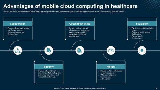 The given slide outlines the potential benefits of using mobile cloud computing in healthcare to streamline concurrent processes. It includes collaboration, security, cost-effectiveness, speed, and scalability. Boost your pitch with our creative Advantages Of Mobile Cloud Computing In Application Areas Of Mobile Cloud Computing. Deliver an awe-inspiring pitch that will mesmerize everyone. Using these presentation templates you will surely catch everyones attention. You can browse the ppts collection on our website. We have researchers who are experts at creating the right content for the templates. So you do not have to invest time in any additional work. Just grab the template now and use them. The given slide outlines the potential benefits of using mobile cloud computing in healthcare to streamline concurrent processes. It includes collaboration, security, cost-effectiveness, speed, and scalability