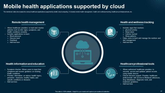 The mentioned slide showcases the various healthcare applications supported by mobile cloud computing. It includes remote health management, health and wellness tracking, healthcare professional tools, etc. The best PPT templates are a great way to save time, energy, and resources. Slidegeeks have 100 percent editable powerpoint slides making them incredibly versatile. With these quality presentation templates, you can create a captivating and memorable presentation by combining visually appealing slides and effectively communicating your message. Download Mobile Health Applications Supported By Cloud Application Areas Of Mobile Cloud Computing from Slidegeeks and deliver a wonderful presentation. The mentioned slide showcases the various healthcare applications supported by mobile cloud computing. It includes remote health management, health and wellness tracking, healthcare professional tools, etc.