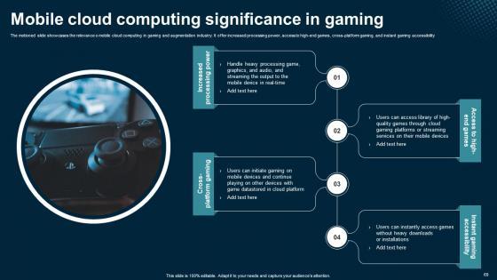 The motioned slide showcases the relevance o mobile cloud computing in gaming and augmentation industry. It offer increased processing power, access to high-end games, cross-platform gaming, and instant gaming accessibility . Take your projects to the next level with our ultimate collection of Mobile Cloud Computing Significance In Gaming Application Areas Of Mobile Cloud Computing. Slidegeeks has designed a range of layouts that are perfect for representing task or activity duration, keeping track of all your deadlines at a glance. Tailor these designs to your exact needs and give them a truly corporate look with your own brand colors they will make your projects stand out from the rest The motioned slide showcases the relevance o mobile cloud computing in gaming and augmentation industry. It offer increased processing power, access to high-end games, cross-platform gaming, and instant gaming accessibility