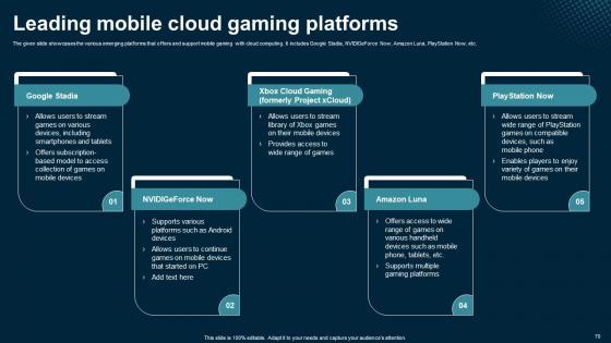 The given slide showcases the various emerging platforms that offers and support mobile gaming with cloud computing. It includes Google Stadia, NVIDIGeForce Now, Amazon Luna, PlayStation Now, etc. Welcome to our selection of the Leading Mobile Cloud Gaming Platforms Application Areas Of Mobile Cloud Computing. These are designed to help you showcase your creativity and bring your sphere to life. Planning and Innovation are essential for any business that is just starting out. This collection contains the designs that you need for your everyday presentations. All of our PowerPoints are 100Percent editable, so you can customize them to suit your needs. This multi-purpose template can be used in various situations. Grab these presentation templates today. The given slide showcases the various emerging platforms that offers and support mobile gaming with cloud computing. It includes Google Stadia, NVIDIGeForce Now, Amazon Luna, PlayStation Now, etc.