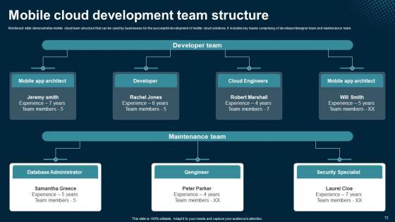 Mentioned slide demonstrates mobile cloud team structure that can be used by businesses for the successful development of mobile cloud solutions. It includes key teams comprising of developer designer team and maintenance team. Coming up with a presentation necessitates that the majority of the effort goes into the content and the message you intend to convey. The visuals of a PowerPoint presentation can only be effective if it supplements and supports the story that is being told. Keeping this in mind our experts created Mobile Cloud Development Team Structure Application Areas Of Mobile Cloud Computing to reduce the time that goes into designing the presentation. This way, you can concentrate on the message while our designers take care of providing you with the right template for the situation. Mentioned slide demonstrates mobile cloud team structure that can be used by businesses for the successful development of mobile cloud solutions. It includes key teams comprising of developer designer team and maintenance team.