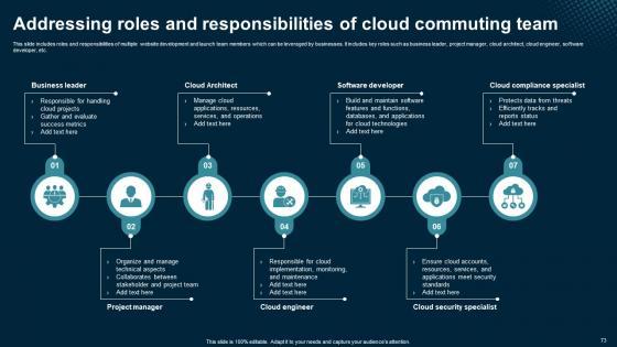 This slide includes roles and responsibilities of multiple website development and launch team members which can be leveraged by businesses. It includes key roles such as business leader, project manager, cloud architect, cloud engineer, software developer, etc. Find a pre-designed and impeccable Addressing Roles And Responsibilities Of Application Areas Of Mobile Cloud Computing. The templates can ace your presentation without additional effort. You can download these easy-to-edit presentation templates to make your presentation stand out from others. So, what are you waiting for Download the template from Slidegeeks today and give a unique touch to your presentation. This slide includes roles and responsibilities of multiple website development and launch team members which can be leveraged by businesses. It includes key roles such as business leader, project manager, cloud architect, cloud engineer, software developer, etc.