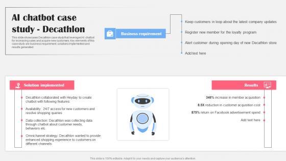 This slide showcases Decathlon case study that leveraged AI chatbot for increasing sales and acquire new customers. Key elements of this case study are business requirement, solutions implemented and results generated The AI Chatbot Case Study Decathlon AI Bot Application For Various Industries Diagrams Pdf is a compilation of the most recent design trends as a series of slides. It is suitable for any subject or industry presentation, containing attractive visuals and photo spots for businesses to clearly express their messages. This template contains a variety of slides for the user to input data, such as structures to contrast two elements, bullet points, and slides for written information. Slidegeeks is prepared to create an impression. This slide showcases Decathlon case study that leveraged AI chatbot for increasing sales and acquire new customers. Key elements of this case study are business requirement, solutions implemented and results generated