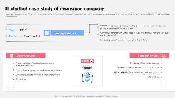 This slide showcases case study of healthcare company that leveraged AI chatbot for increase sales of insurance products and create awareness among customers. Its key elements are campaign overview, chatbot features and campaign results Are you searching for a AI Chatbot Case Study Insurance AI Bot Application For Various Industries Microsoft Pdf that is uncluttered, straightforward, and original Its easy to edit, and you can change the colors to suit your personal or business branding. For a presentation that expresses how much effort you have put in, this template is ideal With all of its features, including tables, diagrams, statistics, and lists, its perfect for a business plan presentation. Make your ideas more appealing with these professional slides. Download AI Chatbot Case Study Insurance AI Bot Application For Various Industries Microsoft Pdf from Slidegeeks today. This slide showcases case study of healthcare company that leveraged AI chatbot for increase sales of insurance products and create awareness among customers. Its key elements are campaign overview, chatbot features and campaign results